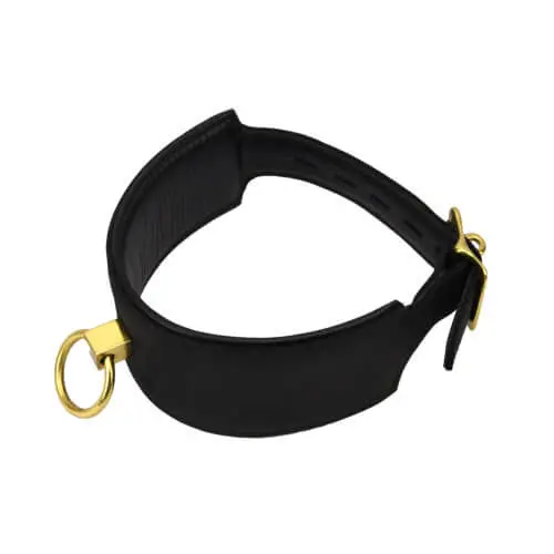 Este collar de cuero nobuk negro cuenta con un interior acolchado que garantiza comodidad incluso durante un uso prolongado, mientras que su resistente anilla de latón permite sujetar correas u otros accesorios con total seguridad. Su sistema de cierre ajustable con hebilla de seis orificios y opción de candado ofrece un ajuste firme y personalizado.